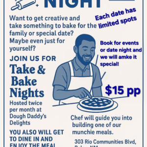 Take and bake night is coming up again this Sunday November 2nd from 4-6 pm!This week we’re doing cornbread pies! Bring the family or make it a date night!Two sessions:4-5pm OR 5-6pm (limited spaces) NO prep pay needed just call and get your name on the list.