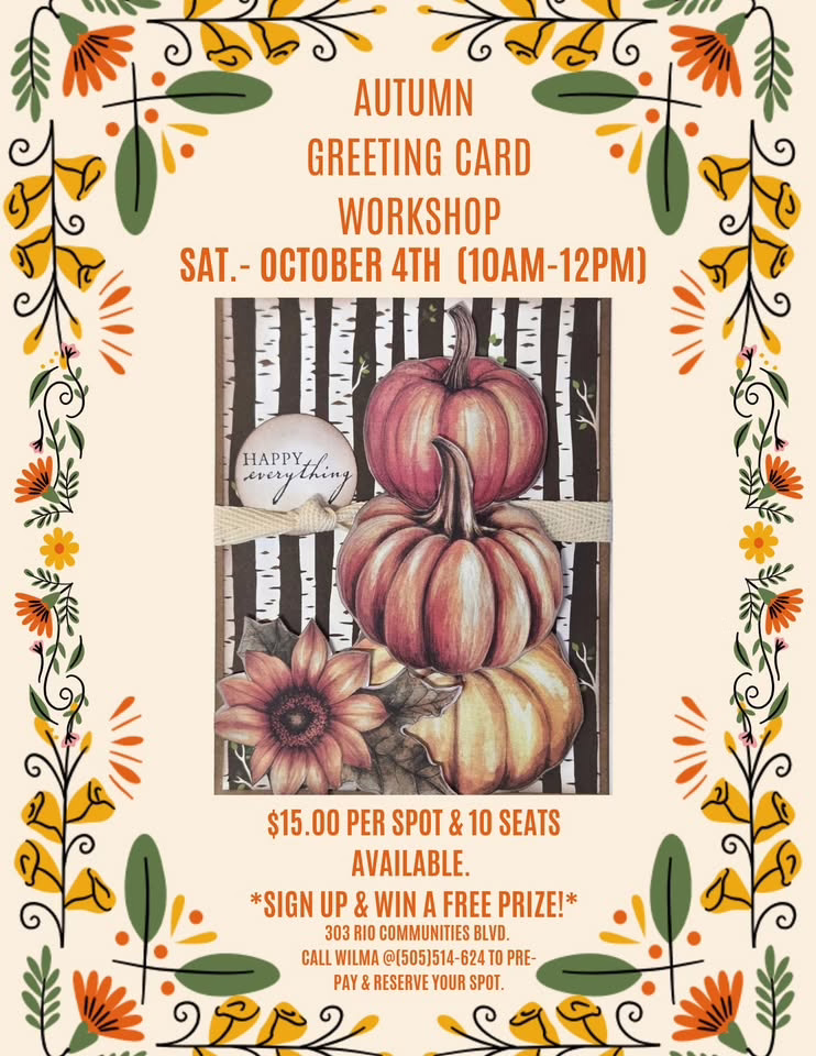 Come make a beautiful Autumn style greeting card. Learn the ropes from beggining to end on how to cut, embelish, and attach layer on layer of paper to create a gorgeous card to give away to a loved one.
