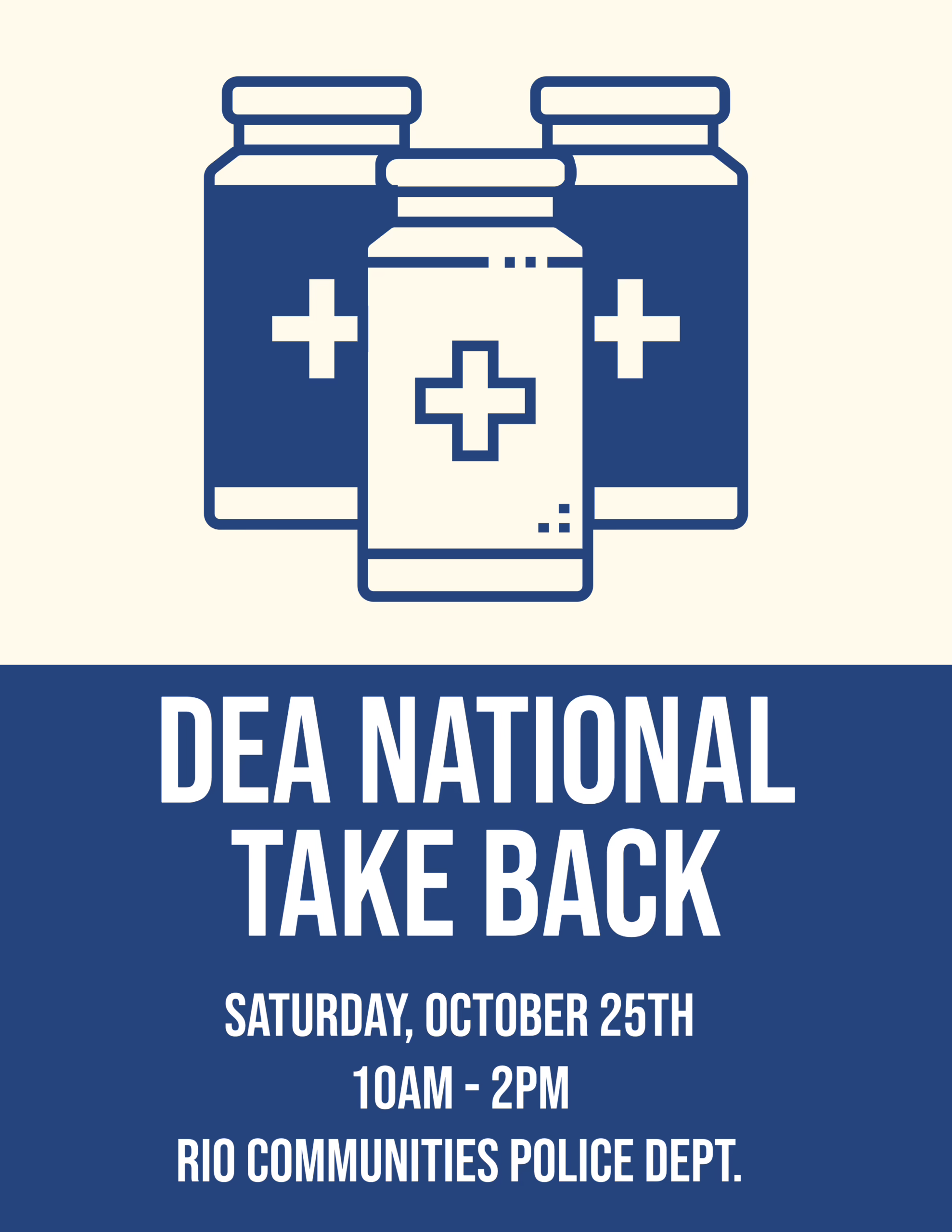Turn in unneeded medication for safe disposal from 10 a.m. to 2 p.m., Saturday, Oct. 25, at the Rio Communities Police Department, 360 Rio Communities Blvd.