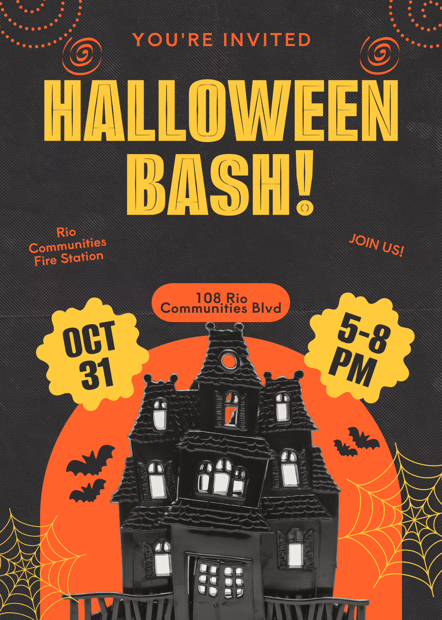 The Rio Communities Fire Department Auxiliary is hosting a free Halloween Bash from 5-8 p.m., Friday, Oct. 31, at the main station, 108 Rio Communities Blvd. There will be trick-or-treating, hot cocoa and coffee, games and more.