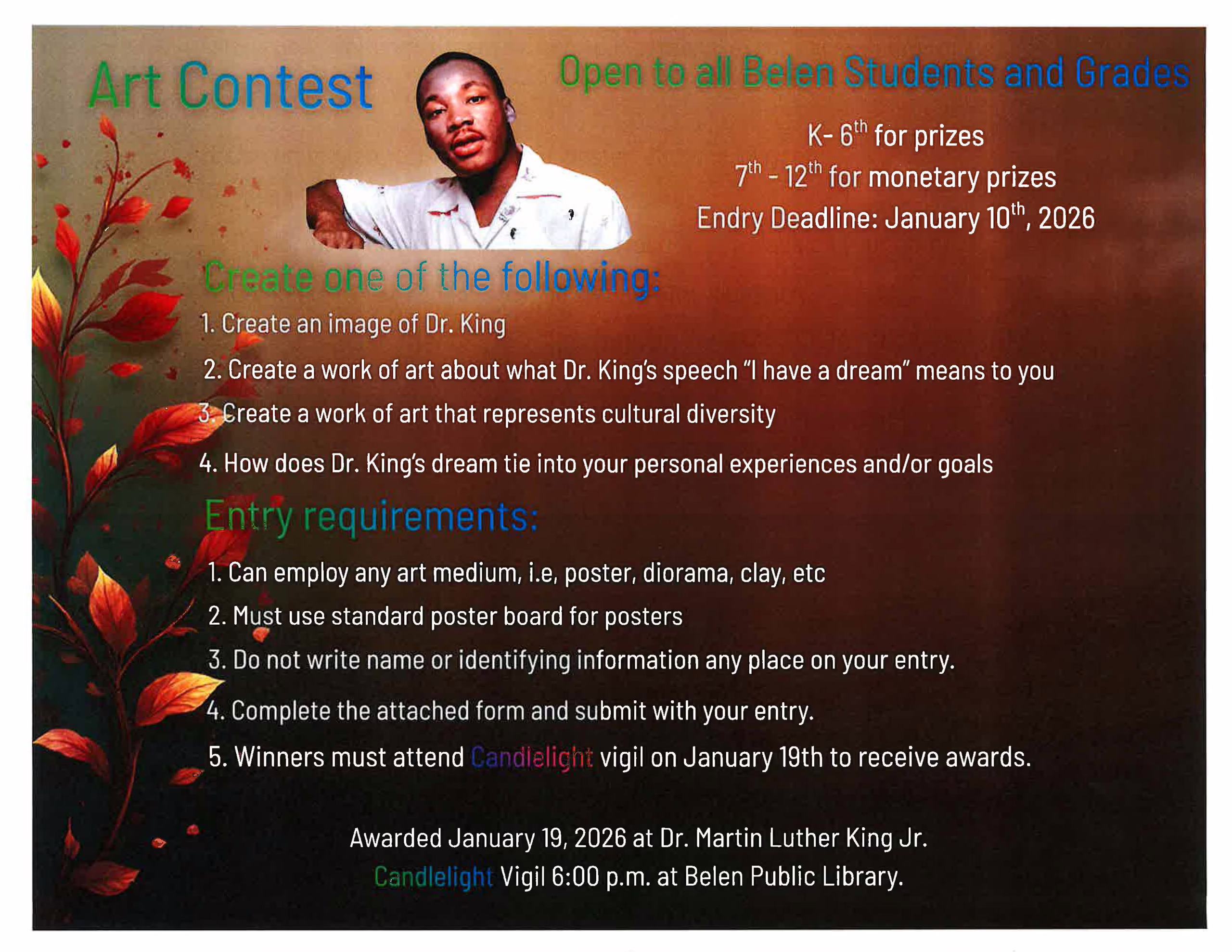 MLK, Jr. Art Contest Packet – Please download this packet for the entry form. Once completed, submit form and your artwork to the Belen Dr. Martin Luther King, Jr. Multicultural Commission, Kathleen Pickering, Belen Public Library, 333 Becker Ave, Belen, NM.