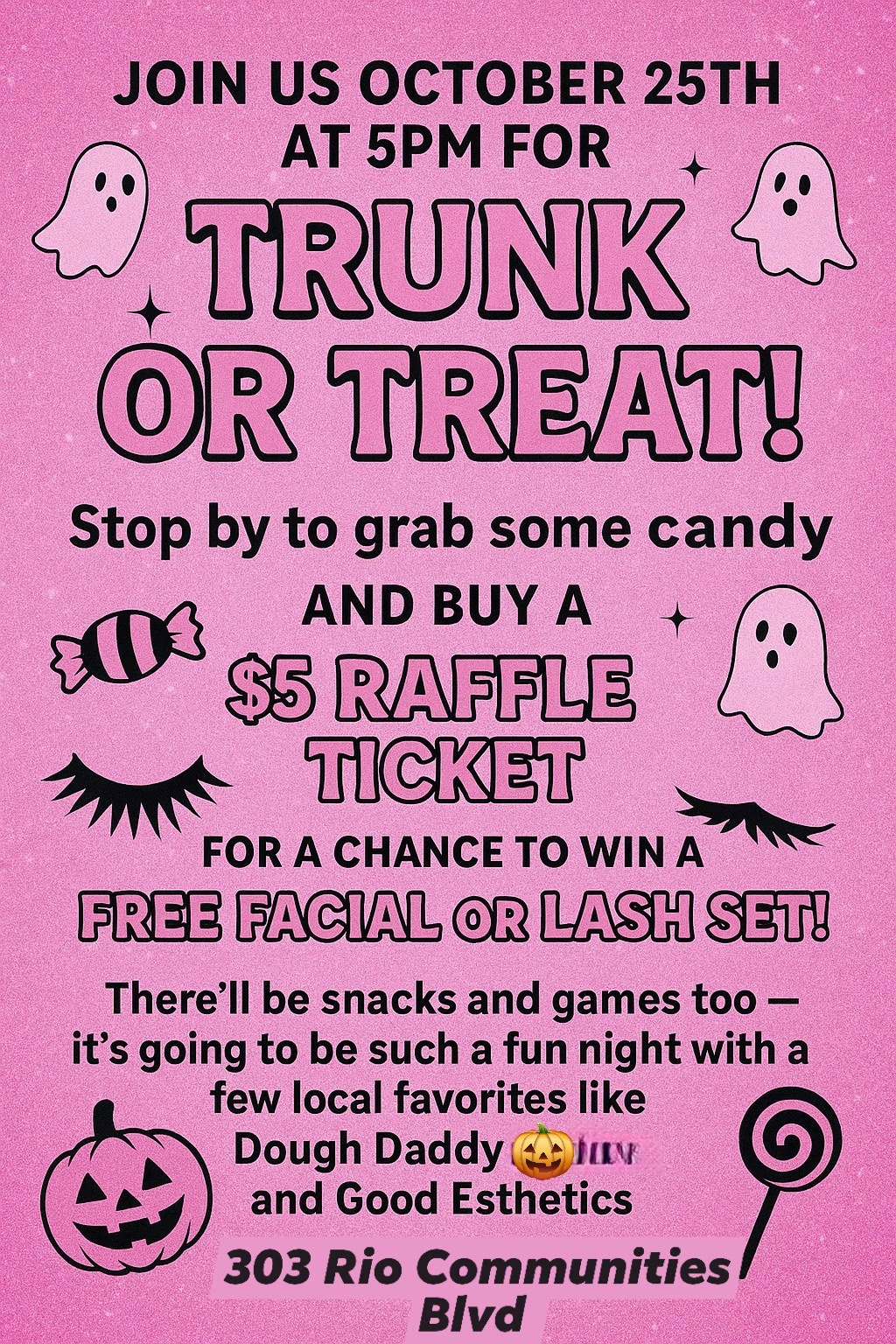 The Rio Communities Police Department, Dough Daddy’s and Goodesthetics will be holding a Trunk or Treat from 5-8 p.m., Saturday, Oct. 25, at 303 Rio Communities Blvd. Bring your whole family for food and drinks, face painting, games, hay rides and more surprises.