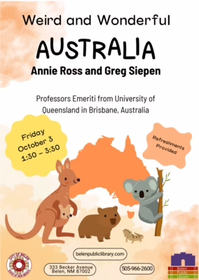 We have 2 professors from University of Queensland in Brisbane, Australia coming to speak at the library on Friday, October 3rd from 1:30 to 3:00 to talk about Weird and Wonderful Australia.