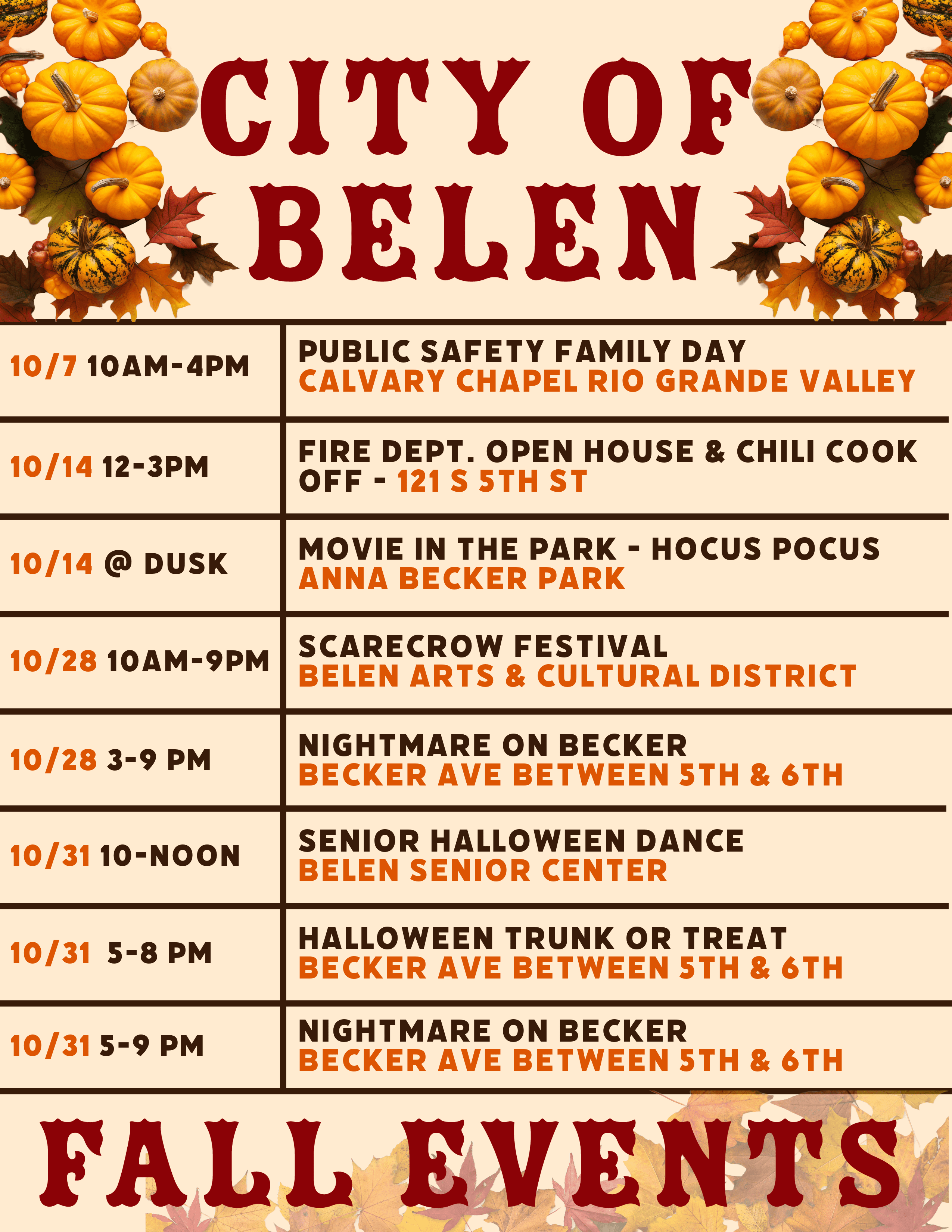 Fall in Belen is a magical time filled with tons of things to do! The City of Belen has put together a flyer highlighting some of their events, and the Scarecrow Festival for the month of October. Don’t forget to check out our event calendar for even more things to do!