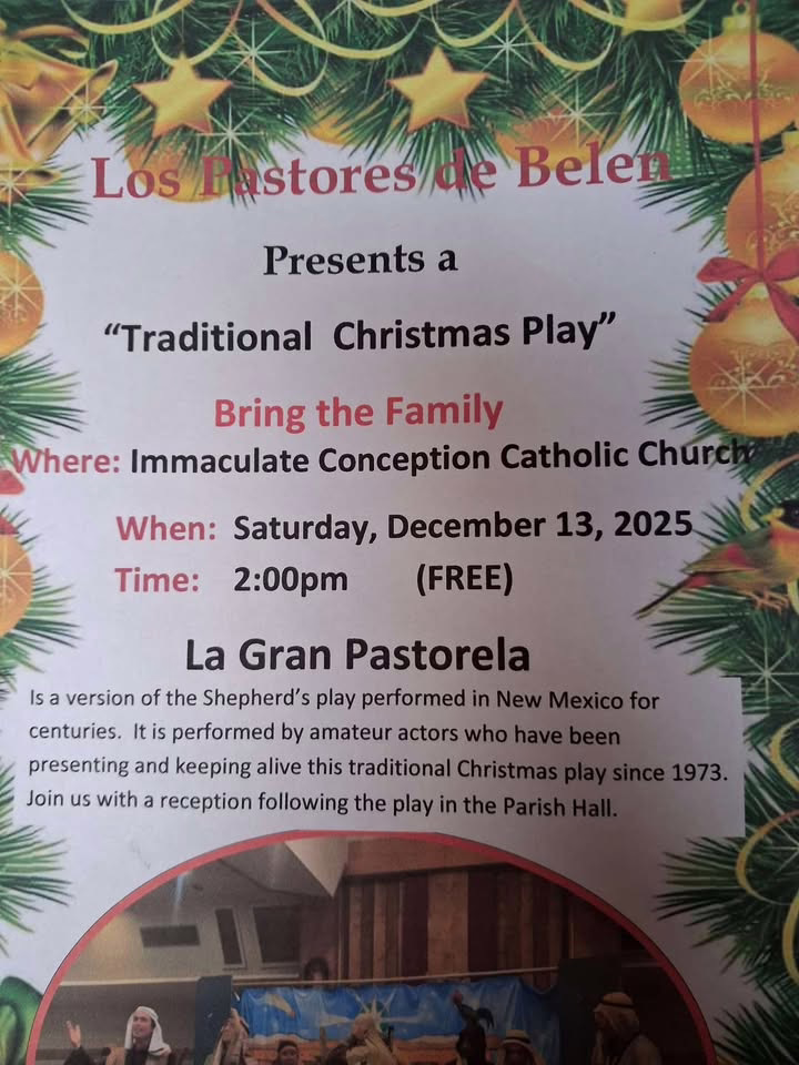 Los Pastores de Belen presents: A Traditional Christmas Play – 2pm – Immaculate Conception Church – Los Pstores de Blen presents a Traditional Christmas Play. Bring the family! Where: Immaculate Conception Catholic Church When: Saturday, December 13 Time: 2pm FREE. La Gran Pastorela is a version of the Shepherd’s play performed in New Mexico for centuries. It is performed by amateur actors who have been presenting and keeping alive this traditional Christmas play since 1973. Join us with a reception following the play in the Parish Hall.