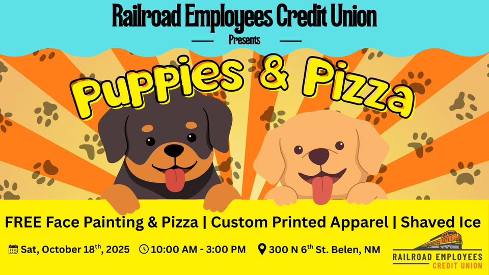 Puppies and Pizza – 10am-3pm – Railroad Employees Credit Union – Come hang out at our annual Puppies & Pizza event! We’re teaming up with the Valencia County Shelter and local businesses to bring the community together and help adorable pups find their forever homes.