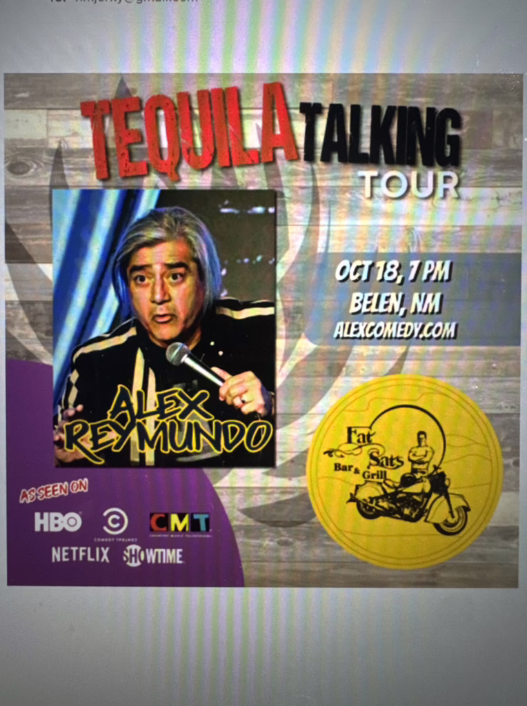 Tequila Talking Tour – 7pm – Fat Sat’s Bar and Grill – Who’s ready for a comedy night? Alex Reymundo is hitting the stage at FAT SATS BAR AND GRILL on October 18th! Don’t miss out, get your tickets now! Visit Fat Sats or hit Randy Gettings up at 505 738-9844.